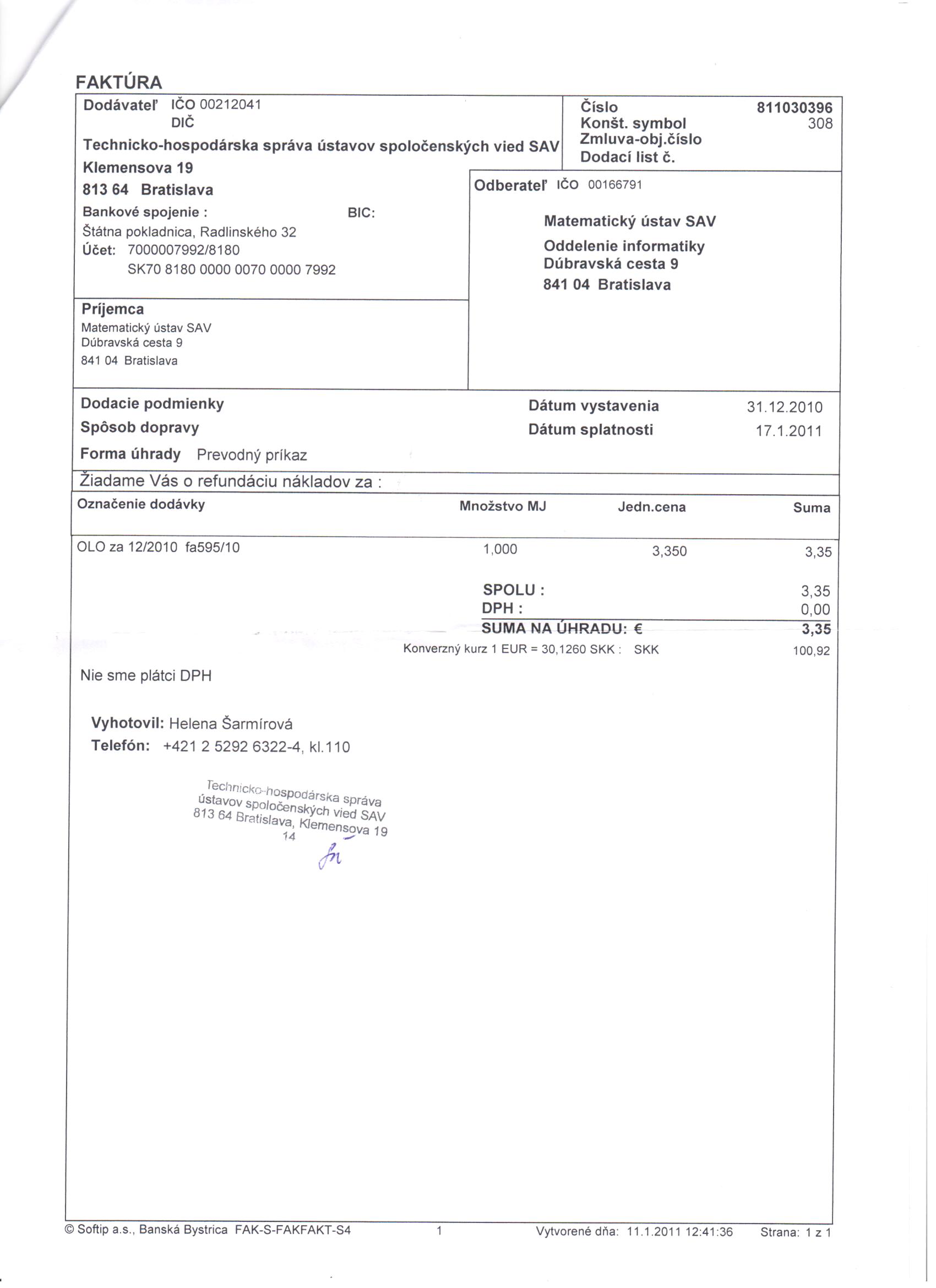 | 17/2011 | Technicko-hospodárska správa ústavov spoločenských vied SAV | MÚ SAV Oddelenie Informatiky | 17.01.2011 | 31.12.2010 | |