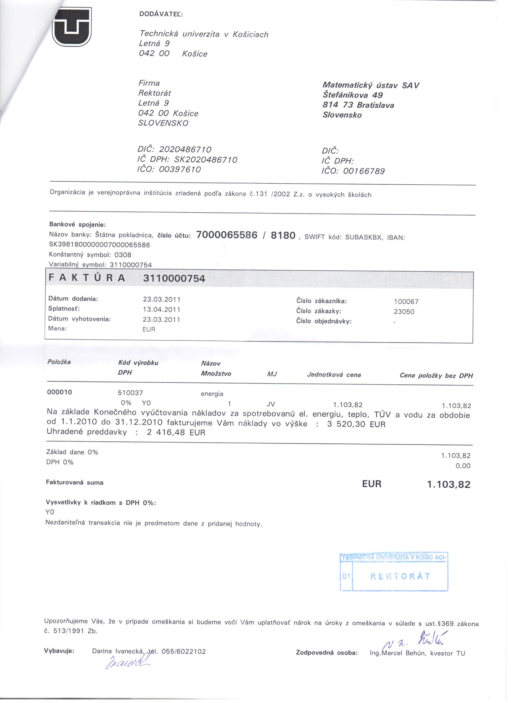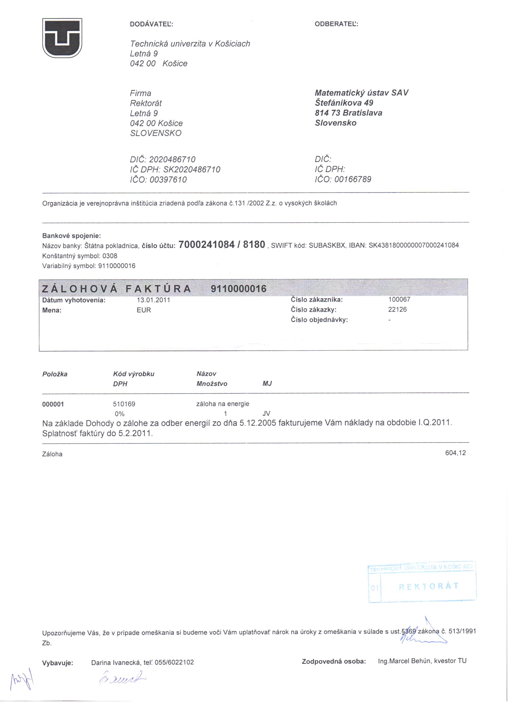 | 20/2011 | Rektorát TU Košice | MÚ SAV Bratislava | 05.02.2011 | 13.01.2011 | |