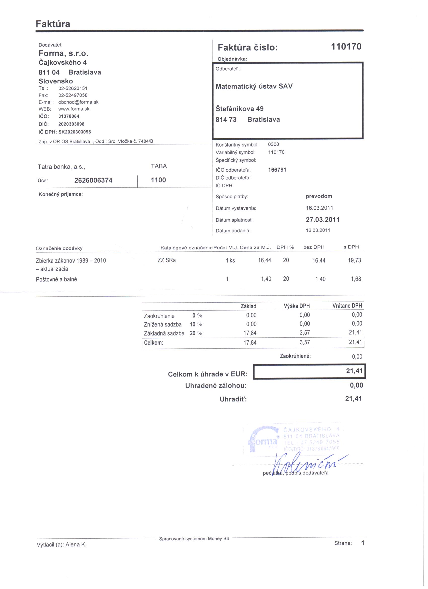 | 31/2011 | OFFICE DEPOT s.r.o. | MÚ SAV Bratislava | 28.01.2011 | 07.02.2011 | 28.01.2011 |