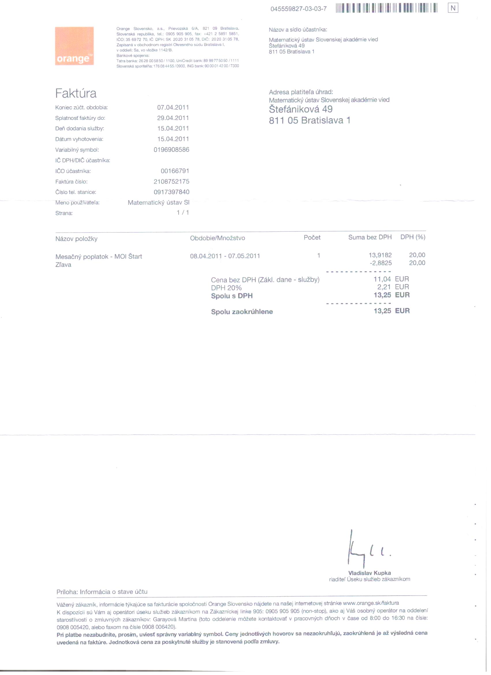 | 3/2011 | Orange Slovensko, a.s. | MÚ SAV Bratislava | 20.12.2010 | 03.01.2011 | 20.12.2010 |